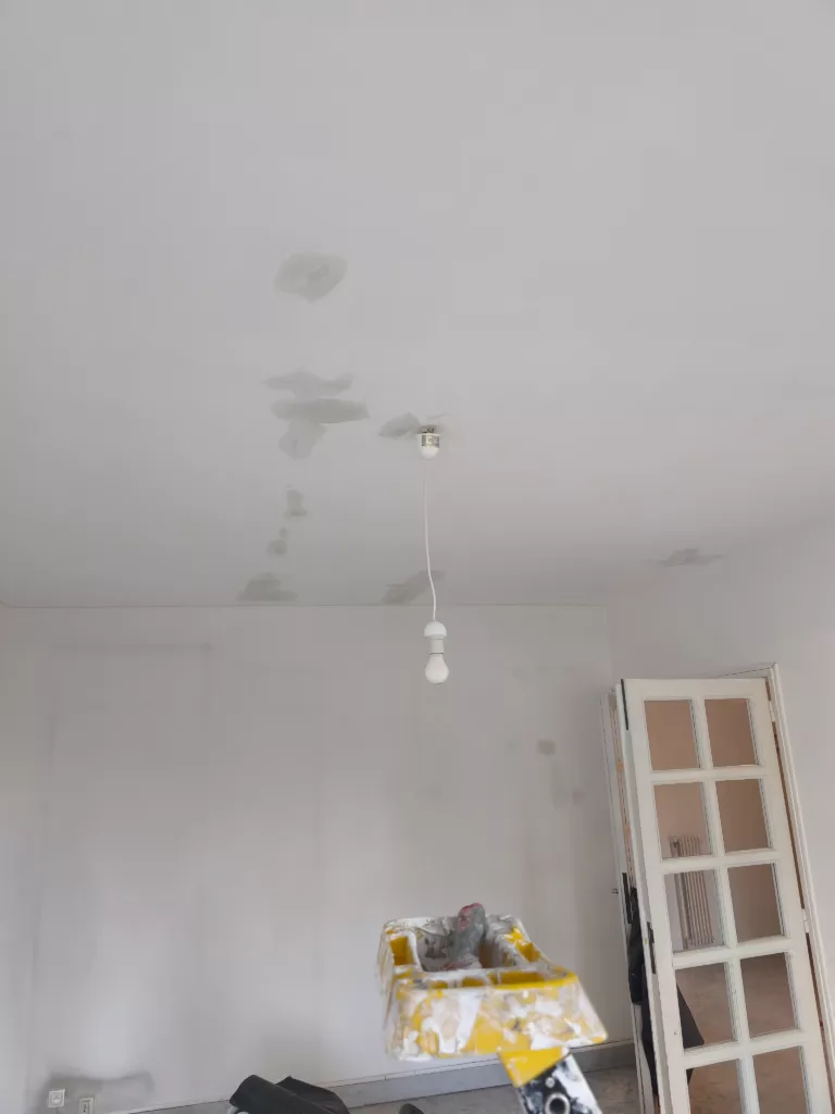 Avant rénovation, les murs de l’appartement présentaient une ancienne tapisserie, des taches visibles et des supports marqués par le temps. La première étape des travaux a consisté à déposer la tapisserie existante, nettoyer les surfaces et traiter les imperfections.